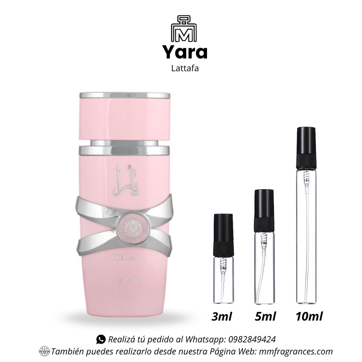 Yara de Lattafa Perfumes es una fragancia de la familia olfativa Oriental Vainilla para Mujeres. Yara se lanzó en 2020. Las Notas de Salida son orquídea, heliotropo y naranja tangerina; las Notas de Corazón son Acuerdo goloso y frutas tropicales; las Notas de Fondo son vainilla, almizcle y sándalo.